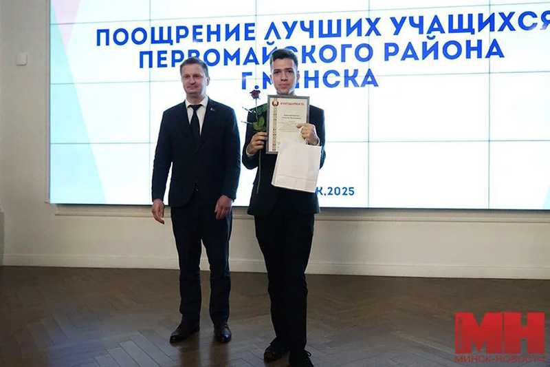 Глава районной администрации отметил, что в этом году было принято решение пригласить талантливых и активных ребят Первомайского в одно из старейших строений белорусской столицы — здание Президиума НАН Беларуси. За успехи в учебе и общественной работе лучшие выпускники школ, гимназий и Минского городского кадетского училища наградили благодарностями за подписью главы районной администрации.