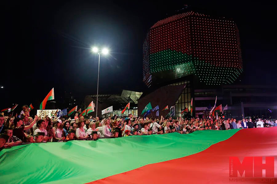 Руководство администрации Первомайского района вместе с жителями столицы спели гимн Республики Беларусь на площадке возле Национальной библиотеки.
