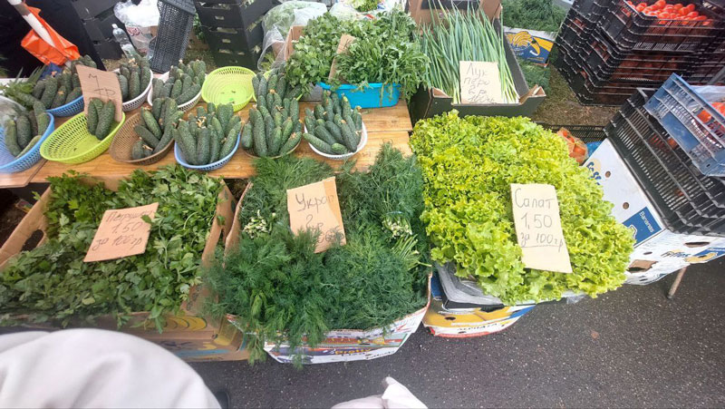 Рядом на столах зелень: укроп по 1,2, петрушка — 1,5 за 100 г, зеленый лук — 2 рубля за килограмм.