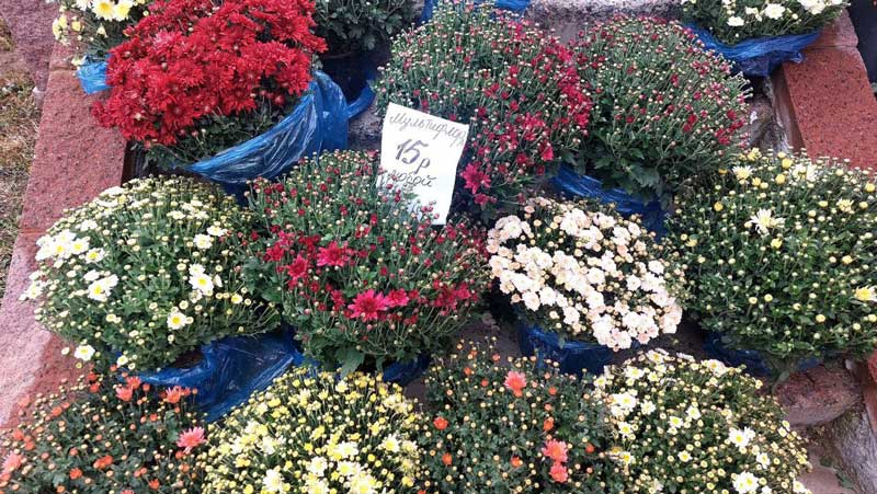 У входа сразу привлекают внимание букеты хризантем по 15 рублей и нежные композиции из статицы за 10 рублей.