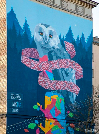 Мурал «Вытинанка» изображен на здании ГУО «Средняя школа № 114 г.Минска имени Симона Боливара» по адресу: ул. Тикоцкого, 9. Внизу слова Н. Загорской «Зямля мая, зямля бацькоў святая».