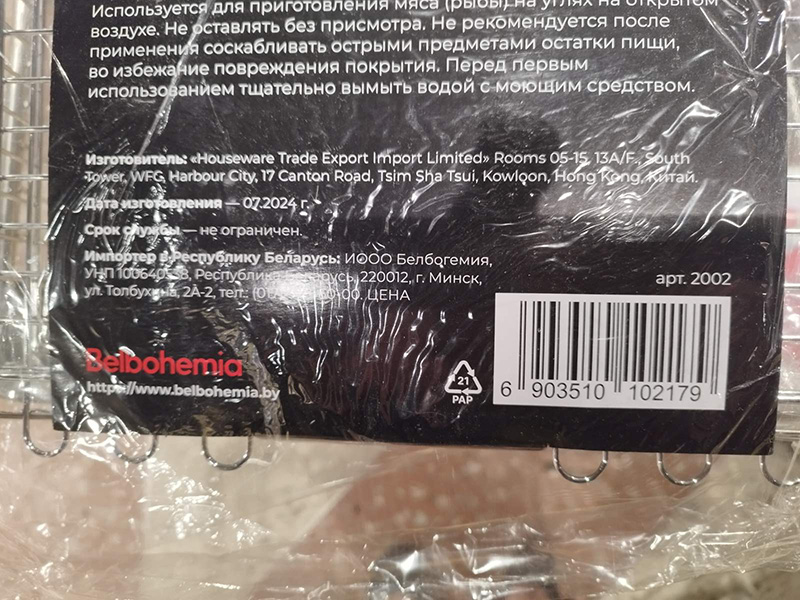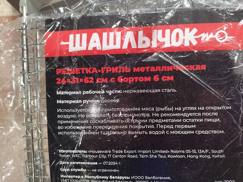 - при обращении продукция решетка-гриль металлическая 24х31х62 см с бортом 6 см ШАШЛЫЧОК, арт. 2002, дата изготовления: 07.2024, срок службы не ограничен, материал рабочей части: нержавеющая сталь; материал ручки: дерево; используется для приготовления мяса (рыбы) на углях на открытом воздухе; штриховой код: 6903510102179, не соответствовала установленным гигиеническим нормативам, что подтверждено протоколом №57-20/00417-00421 испытания изделий из полимерных и других материалов от 16.06.2025 государственного учреждения «Минский городской центр гигиены и эпидемиологии» в образце № 417 (проба №1.610/6/92) в 0,3 % растворе молочной кислоты при 800С обнаружена концентрация железа 3.300 мг/дм3, при ДКМ не более 0.3 мг/дм3; протоколом №57-20/00451-00451 испытания изделий из полимерных и других материалов от 26.06.2025 государственного учреждения «Минский городской центр гигиены и эпидемиологии» в образце № 451 (проба №1.650/6/97) в 0,3 % растворе молочной кислоты при 800С обнаружена концентрация железа 1.250 мг/дм3, при ДКМ не более 0.3 мг/дм3 (контрольная проба), что является нарушением требований части 1 пункта 12 «Общих санитарно- эпидемиологических требований к содержанию и эксплуатации капитальных строений (зданий, сооружений), изолированных помещений и иных объектов, принадлежащих субъектам хозяйствования», утверждённых Декретом Президента Республики Беларусь от 23.11.2017 № 7 «О развитии предпринимательства».